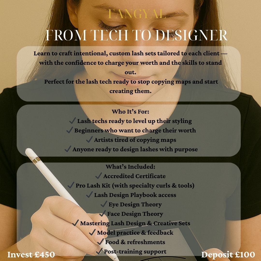 Take your lash styling skills to the next level with our exclusive 1-1 version of the From Tech to Designer course. This premium training is tailored entirely to you, offering focused support, deeper guidance, and a completely customised learning experience to help you evolve from a lash technician into a lash artist.